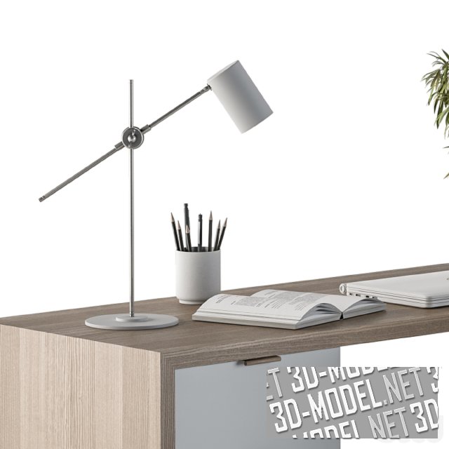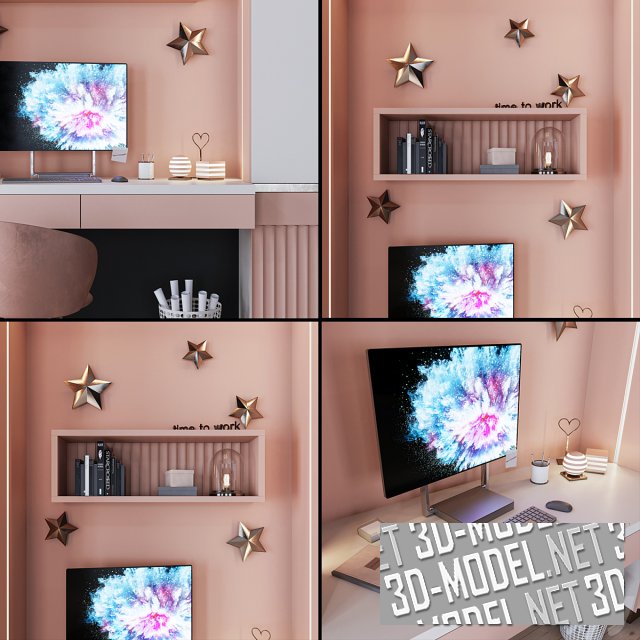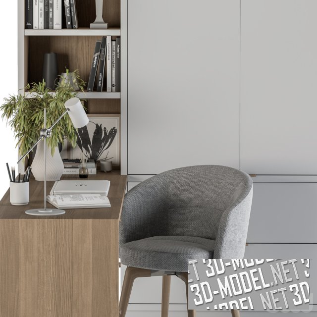 На декоративной панели черные круглые настенные часы с белыми контурными пиктограммами, перекликающимися с грифельной доской в левой части мебельной группы. На письменном столе монитор компьютера, настольный светильник, ваза с растением, фоторамка, органайзер, аромо-диффузор, книги.