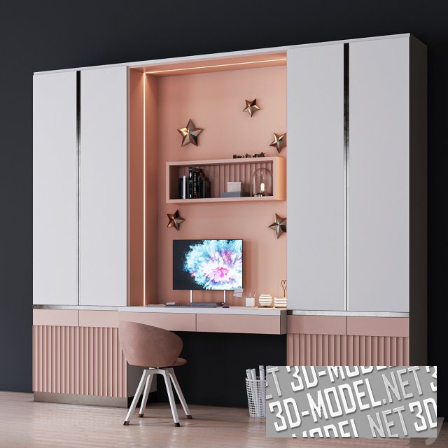 Практически по центру блока разместился шкаф с четырьмя глухими фасадами приглушенного голубого цвета с системой «нажал-открыл». Небольшой навесной письменный стол с тремя выдвижными ящиками под столешницей интегрирован небольшой частью в шкаф. Столик выполнен из того же материала, что и пенал с полками - серо-коричневое дерево. Из такого же материала изготовлены три небольшие книжные полки, разместившиеся над столом на фоне большой панели голубого цвета с вертикальной фрезеровкой. Полки объединены двумя серовато-синими вертикальными рейками. На полках мягкий игрушечный заяц, модель биплана, домики, книги, серебристый кувшинчик.