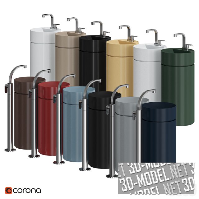 Представлены двенадцать вариантов цвета раковин и подиумов: белый матовый и глянцевый, серый, черный матовый, черный глянцевый, коричневый, бежевый, бледно-желтый, темно-синий, красный, бледно-голубой, темно-зеленый. Габарит раковины: d42\h88см.