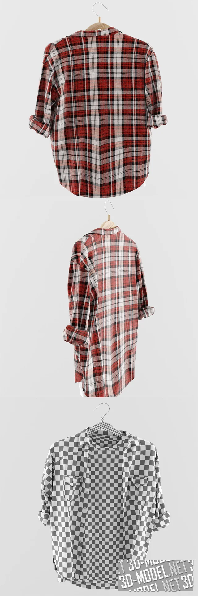 Современная клетчатая красно-черно-белая мужская рубашка с длинными закатанными рукавами и белая футболка на деревянной вешалке. На передней плоскости футболки нанесен темно-коричневым цветом принт в виде головы оленя с рогами.