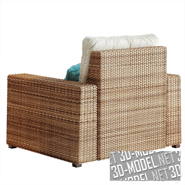 Квадратные подушки на сиденьях и спинках кресел в чехлах из белого текстиля. Несколько декоративных подушек в чехлах с травянисто-зелеными и терракотовыми орнаментами привносят в сцену солнечные, яркие цветные пятна. На столе фарфоровый белый чайник в виде индийского слона, лимоны на белом блюде, лимонад со льдом в прозрачном стеклянном графине и зеленое мелколиственное комнатное растение в белом горшке. Габарит кресла: 106х96х76см. Габариты стола: d83/h50см.