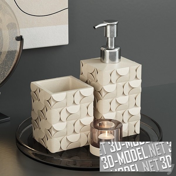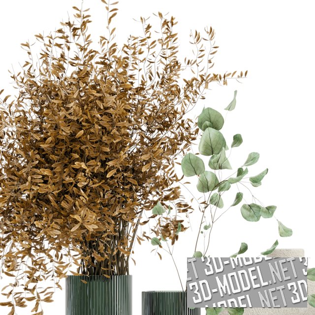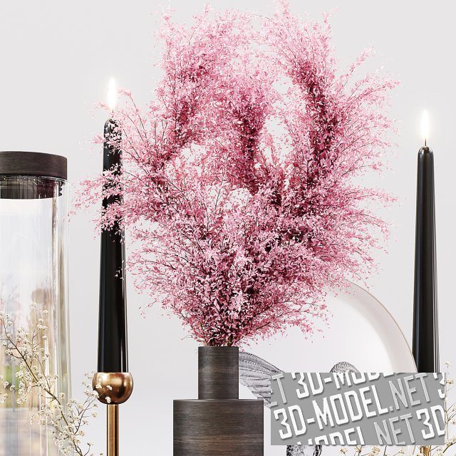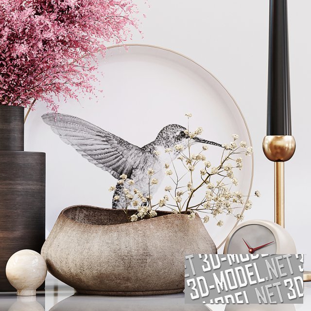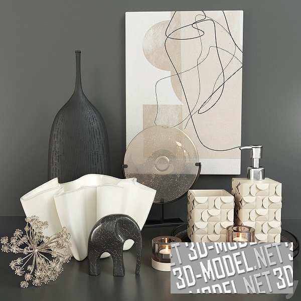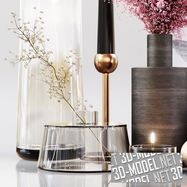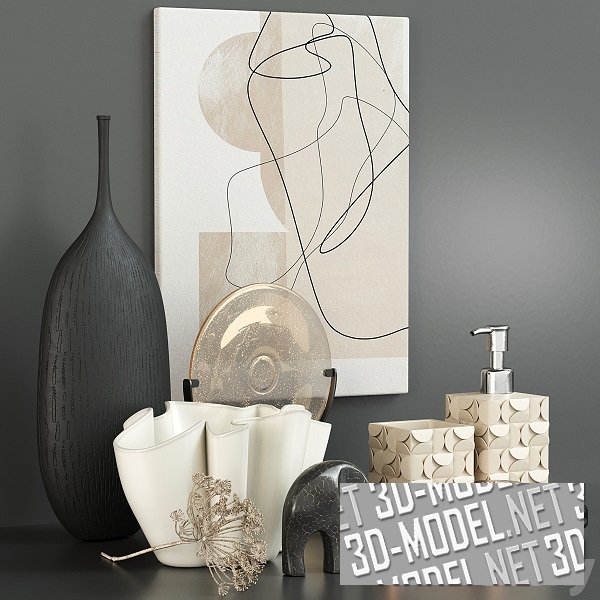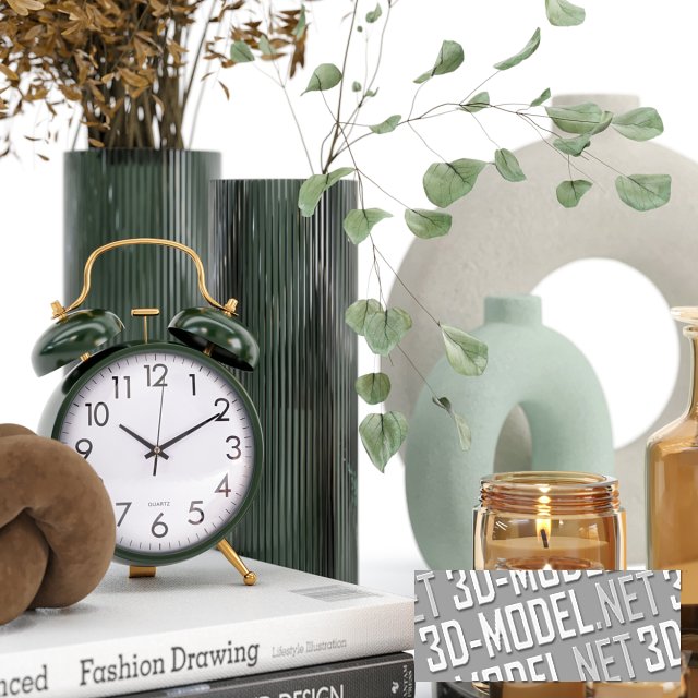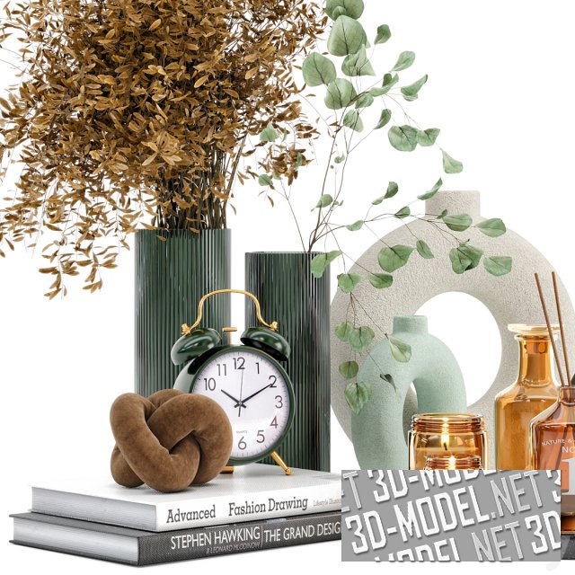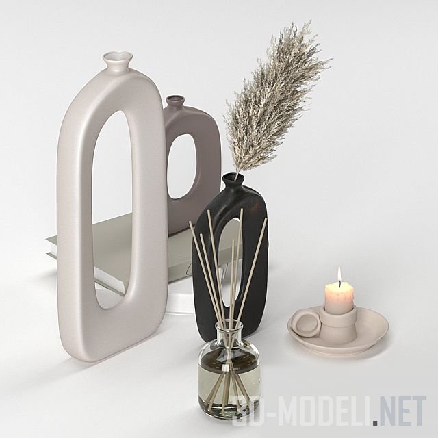 В комплекте современная керамика (серебристая ваза «Лунный кратер», вазочка для конфет, вазы из белой и темной керамики в афро-стиле), зеленый букет из злаковых трав, листьев и нераскрытого бутона в вазе прозрачного стекла, книги, плоские коробочки из серого бархата с металлическими застежками.