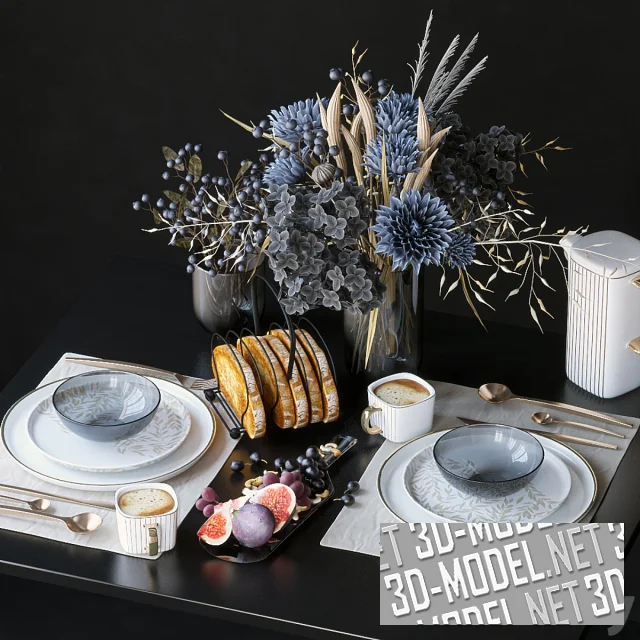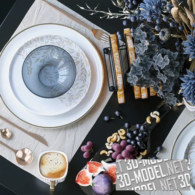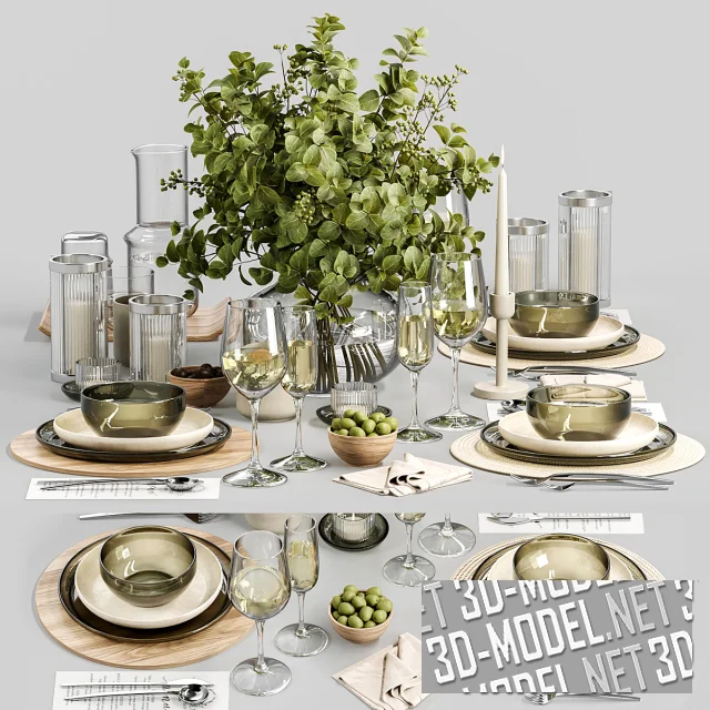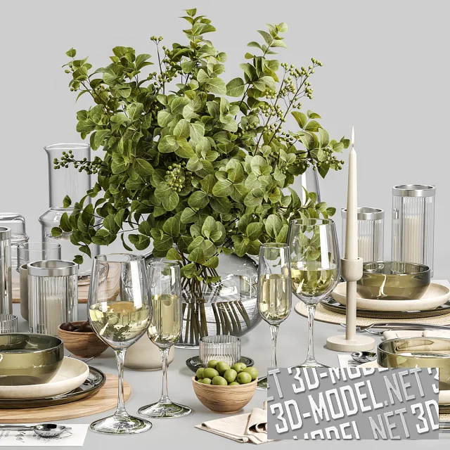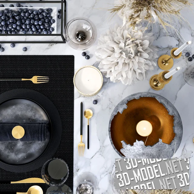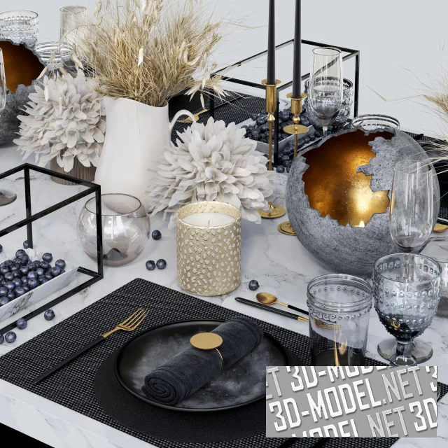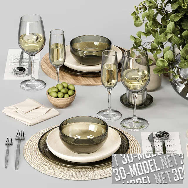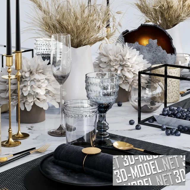 Столовые приборы из полированной нержавейки. Бокалы из прозрачного стекла (некоторые с вином), круглая маленькая и круглая большая вазы с темной зеркальной поверхностью дополняют сет. Лаконичным цветовым акцентом служит тонкая ветка с россыпью красных ягод, размещенная в большой вазе в центре стола.