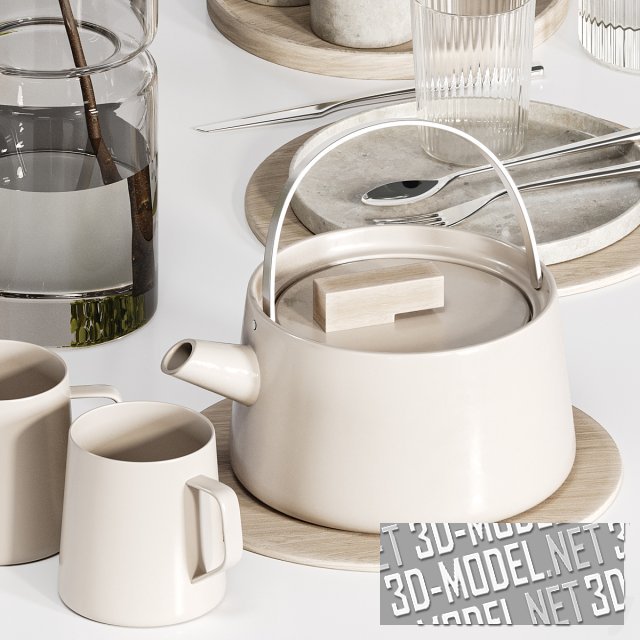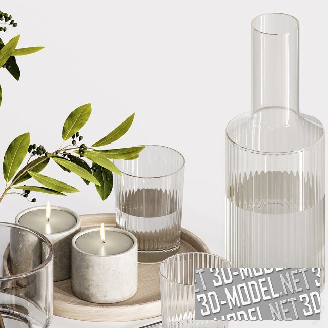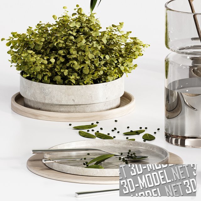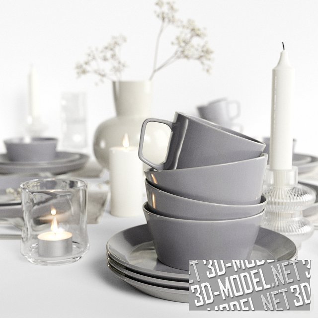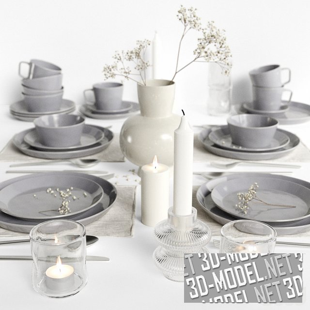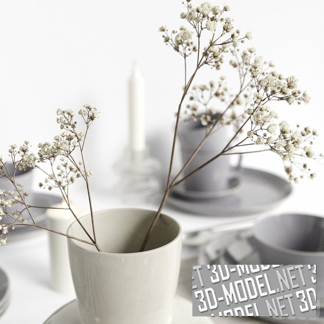 Праздничная сервировка в золотисто-белых тонах, рассчитана на четыре персоны. Сет включает в себя: белые тарелки, салфетки с золотистыми колечками, лаконичные меню, небольшие веточки с мелкими белыми листьями в качестве декора, приборы (бело-золотистые вилка и нож), бокалы с белым вином и пустые коньячные, свечи в стеклянных стаканах. Центральным декором стола служит бежевая керамическая ваза с пышным букетом из сухих метелок и веточек с мелкими белыми листьями.