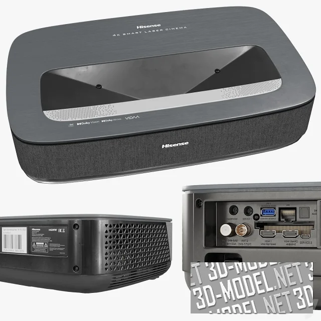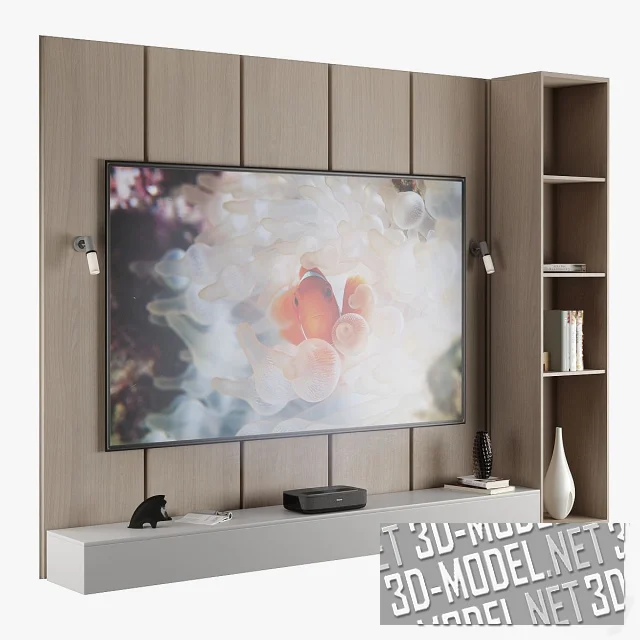 Фрагмент ТВ-стены с отделкой в современном стиле (панели из светлого дерева), с длинной светло-серой низкой тумбой, пеналом в правой части, ТВ-панелью, лазерным проектором Hisense Laser и аксессуарами. Технология Ultra Short Throw Technology, PL1 позволяет размещать проектор на расстоянии от 200см до 300см до стены. Проектор в темно-сером корпусе, с отделкой из текстиля. На полках и тумбе черная керамическая фигурка вепря, журналы и книги, черная и белая вазы, подставка для книг в виде деревянного слона.
