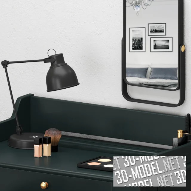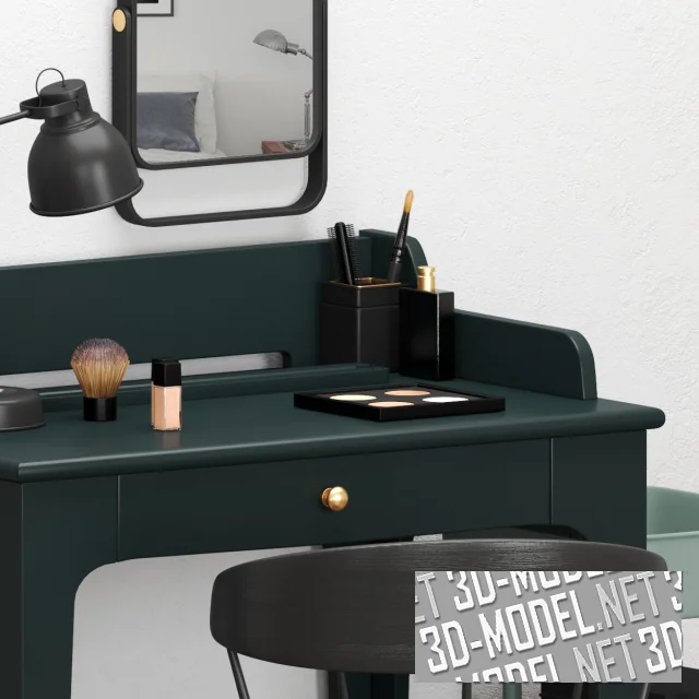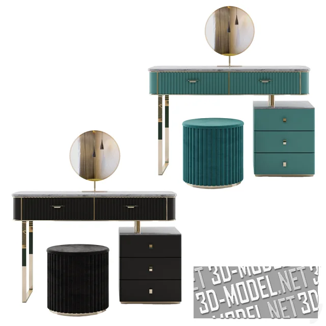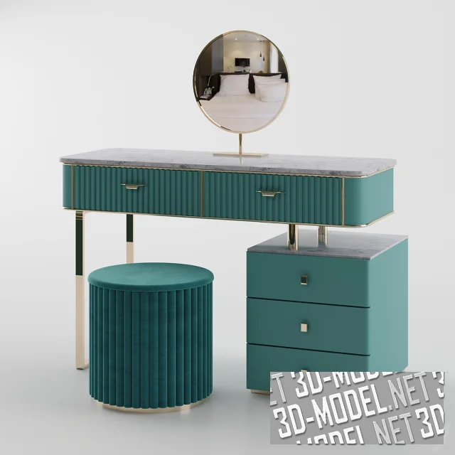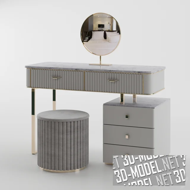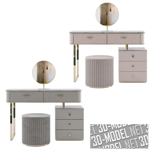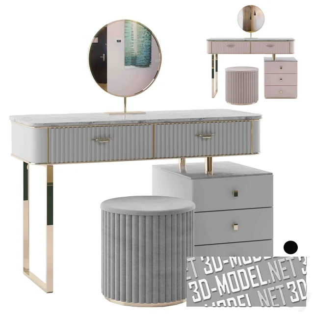 Набор для нанесения макияжа. В комплекте однотумбовый косметический стол с двумя выдвижными ящиками и настольным круглым зеркалом в золотистой раме на подставке, цилиндрический пуф с корпусом, декорированным вертикальной прострочкой, разделяющей плоскость основания на мягкие скругленные элементы.