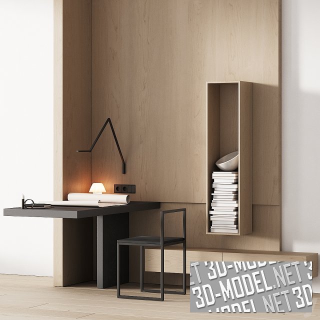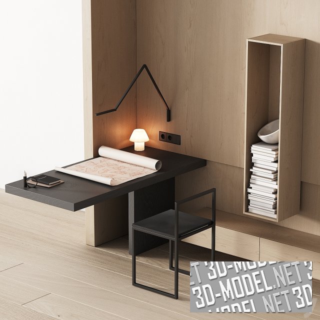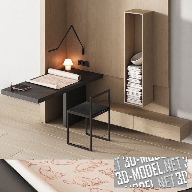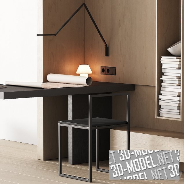 Рабочее место для интерьера современного кабинета: в угол шкафа светло-коричневого цвета с белыми нижними фасадами встроена коричневая столешница. На столешнице настольная лампа с белым абажуром и полуразвернутый рулон бумаги с изображением. Коричневый стул с квадратным сиденьем и белые книги и папки в нише шкафа дополняют набор.