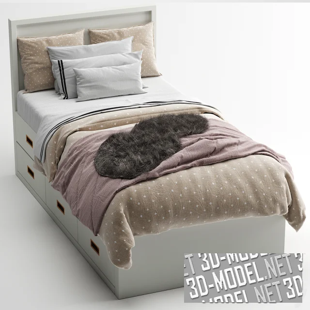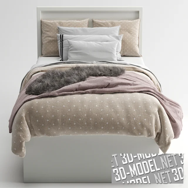 Постельное белье пестрое: белая простынь и часть чехлов подушек, бледно-розово-коричневый плед, одеяло и подушки бежевого цвета с мелкими белыми крестиками, криволинейный кусок темно-серой шкуры с длинным лохматым мехом.