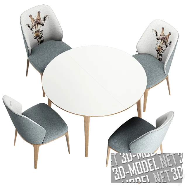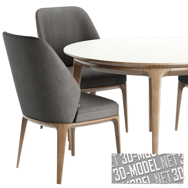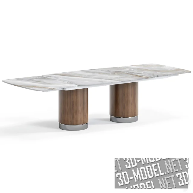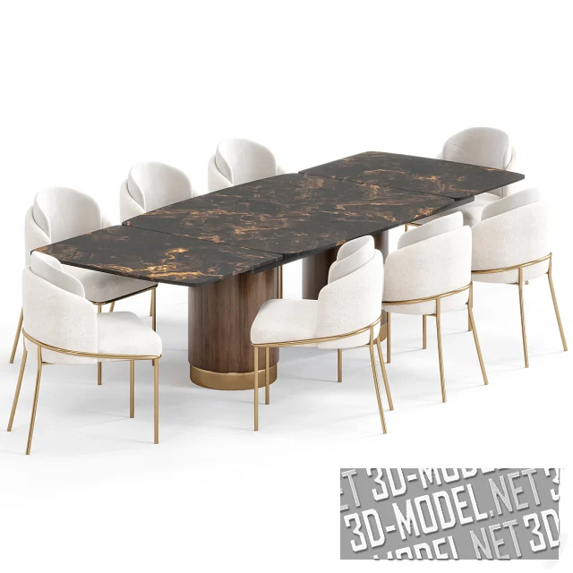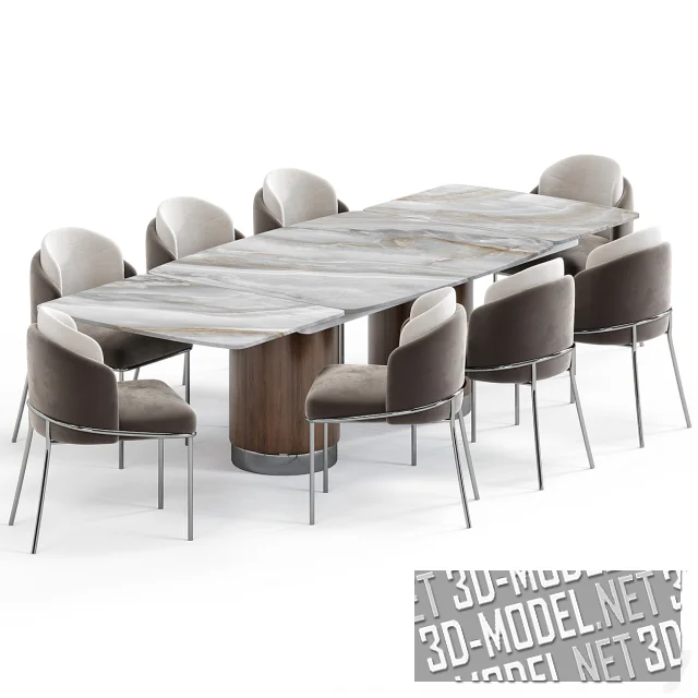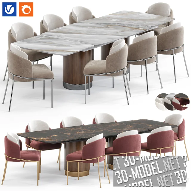 Современный комплект мебели в обеденную зону от Amgrades - стол Chara (297,2х118,6х75см) и стулья Capella (56х65х87см). Стол опирается на две цилиндрические колоновидные опоры. Столешницы трехсоставные, мраморные (два вида: светло-серый с темно-серыми и коричневыми прожилками и черно-коричневый мрамор с желто-оранжевыми прожилками).