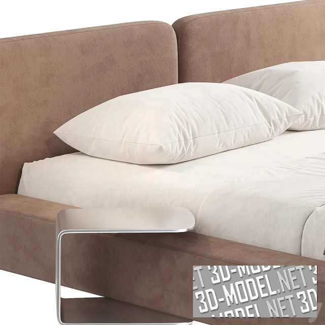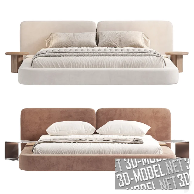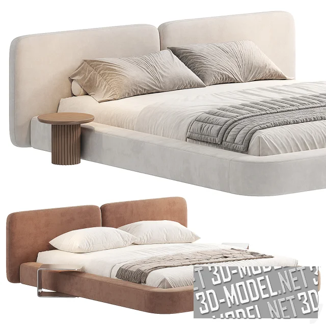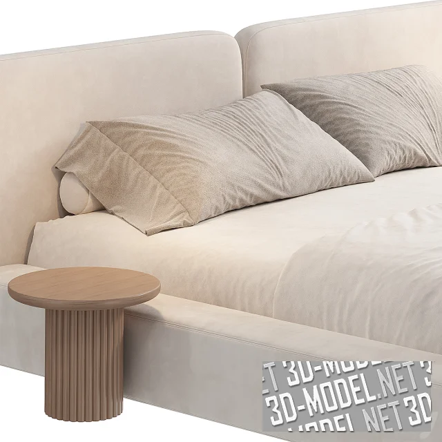 Корпус кровати со скругленными углами, без ножек, образует небольшие плоскости по трем сторонам ниже плоскости матраса. Изголовье состоит из двух одинаковых прямоугольных мягких панелей и немного выходит за границы корпуса справа и слева. Изголовье и корпус кровати обиты велюром. Представлено два варианта обивки: терракотовый и белый, с легкими светло-серыми разводами. Белое постельное белье дополнено одеялами и пледами. С белой обивкой кровати хорошо сочетаются чехлы больших подушек - жемчужно-серые, подушки дополнены горизонтальными мягкими белыми валиками. Одеяло простеганое, серое.