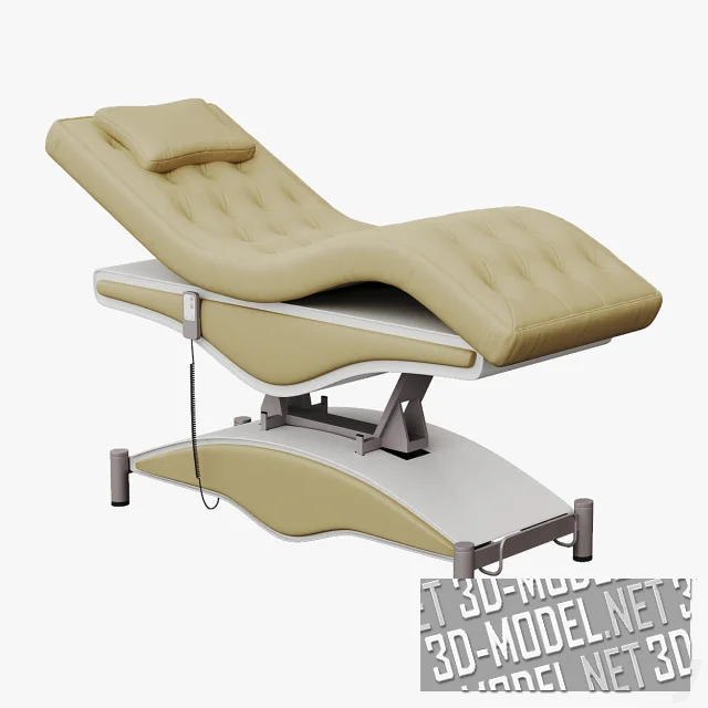 Кушетка выполнена в стильном дизайне с мягкой обивкой и декоративной стежкой, которая придает поверхности аккуратный и дорогой вид. Конструкция оборудована электрическим приводом, позволяющим регулировать наклон и высоту при помощи пульта управления. Изогнутая форма ложа обеспечивает правильное положение тела и максимальное расслабление во время процедур.