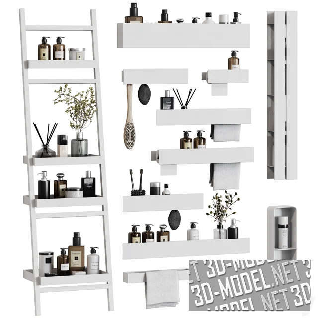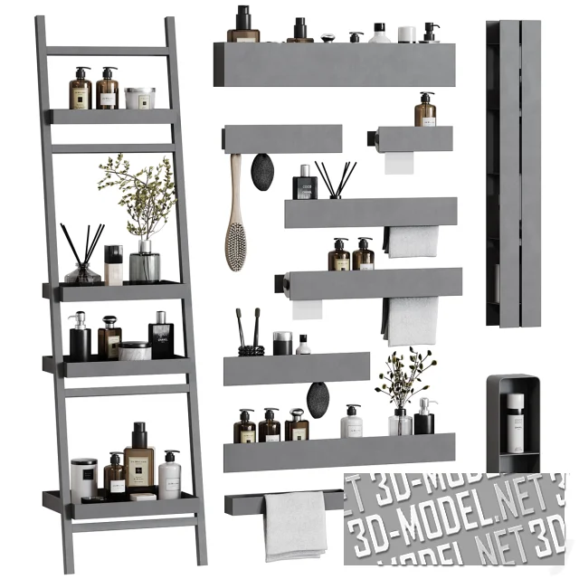 Коллекция современных аксессуаров для ванной комнаты - Tezza. В коллекции широкий спектр полок (Escada; Mono; Invis; Fold; Reta; Hook; Rollo; Due; Tre; Lava; Primo), вешалок и креплений, стеллаж, аксессуары, декор. Аксессуары представлены в трех декорах: черном, белом и сером. На полках и вешалках: флаконы с косметикой и средствами по уходу за телом, вазочки с ветками, аромо-диффузоры в стеклянном флаконе с палочками, зубные щетки, пемза, белые полотенца.