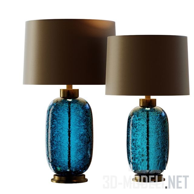 Пара элегантных настольных ламп от Studio Art Glass. Изюминкой моделей являются ножки из синего стекла с пузырьками воздуха Midnight Blue Volcanic Glass. Цилиндрические абажуры с оттенком старой бронзы (Gilt Satin Shade) представлены в двух диаметрах: 406 мм в светильнике высотой 715 мм и 355 мм в светильнике высотой 590 мм.