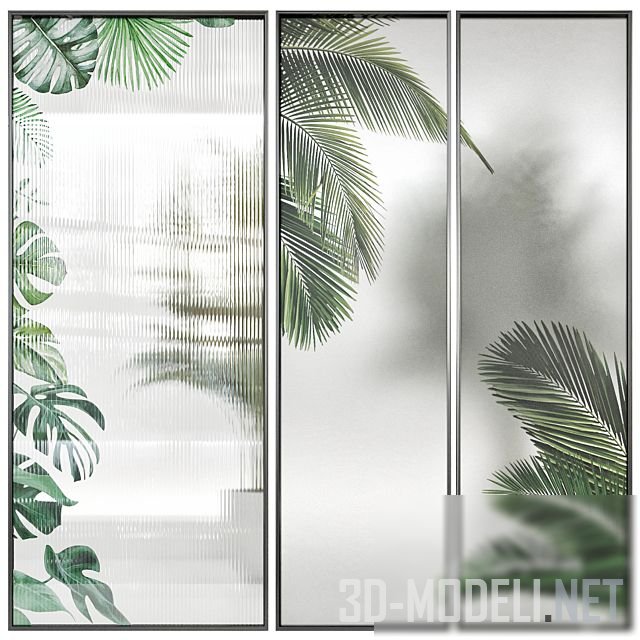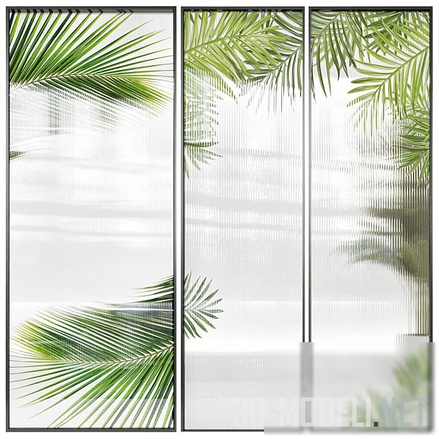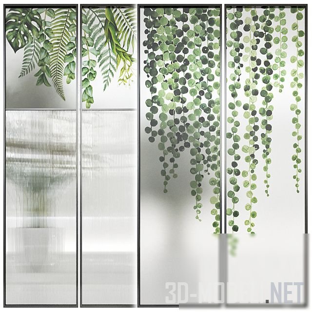 Несколько вариантов декора для перегородки из оргстекла. Стекло рифленое, что отлично сочетается со всеми видами растений (пальмы, монстера и др.), которые украшают поверхность.
