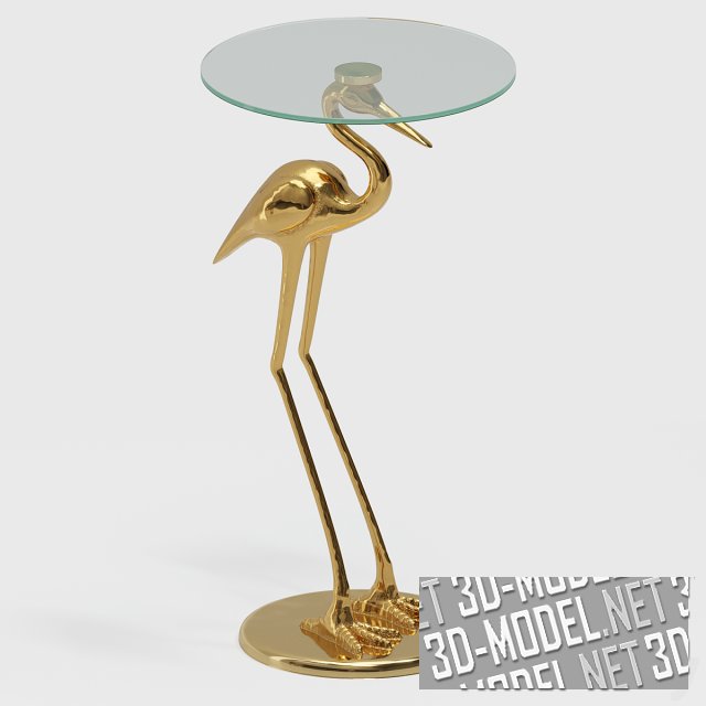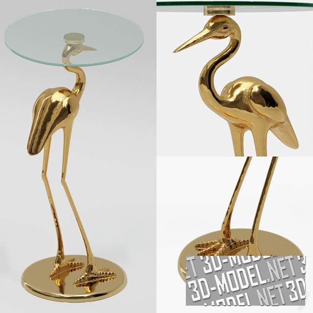 Изящный приставной столик с круглой стеклянной столешницей и основанием в виде золотой фигурки журавля. Такой столик подойдет для интерьера в классическом стиле. Размеры стола: 71х37 см.