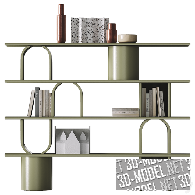 Оригинальный криволинейный асимметричный стеллаж с декором Glowe. Две секции стеллажа (шириной 80 и 130см) выполнены из листового металла. Выгнутые по вертикали, они в разрезе образуют «С». В изгибах этих модулей размещены четыре металлические полки. Поверхность металла гладкая, темно-серебристая, с пятнами.