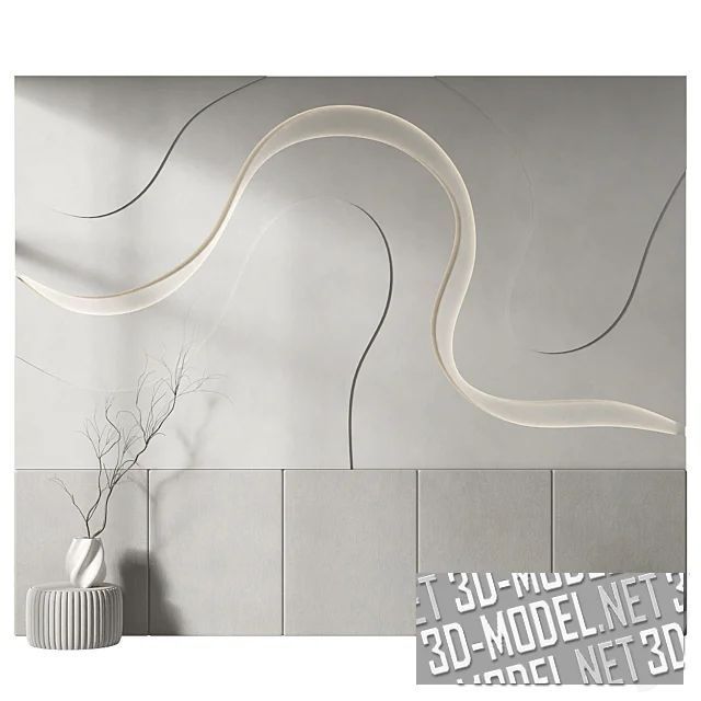 Нижняя треть стены отделана прямоугольными панелями с мягкой светло-серой обивкой. Оставшаяся часть декорирована волнистыми линиями и разделена на три слоя. Внутренняя криволинейная ниша подсвечена скрытой светодиодной лентой. Габарит стены: 360х300х10см.