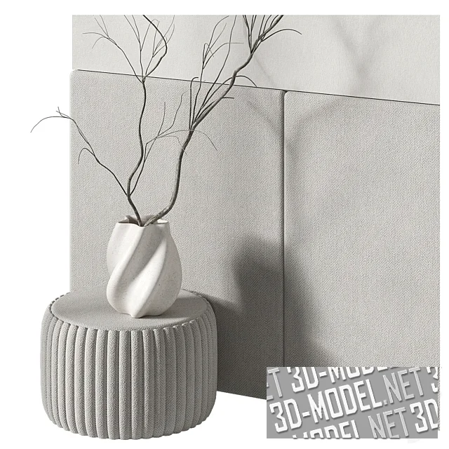 Декор стены в изголовье кровати или для декорирования гостиной в современном стиле, с прикроватными круглыми столиками и вазой (Catayne Daily Mat Etru Botanical Bowl) с сухими ветками. Боковые плоскости столов рельефные, состоят из вертикальных сегментов. Габаритные размеры: d50/h30см.