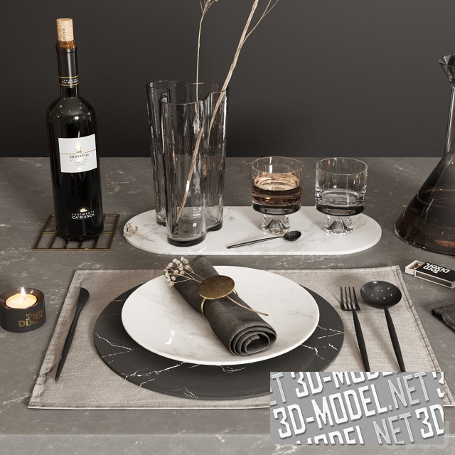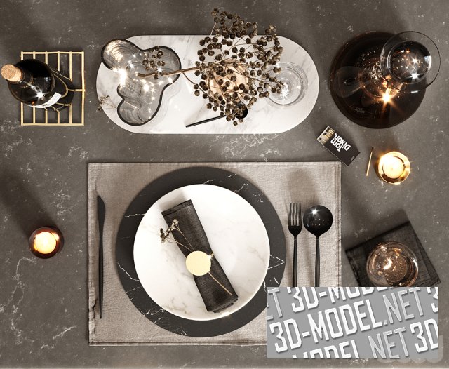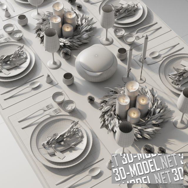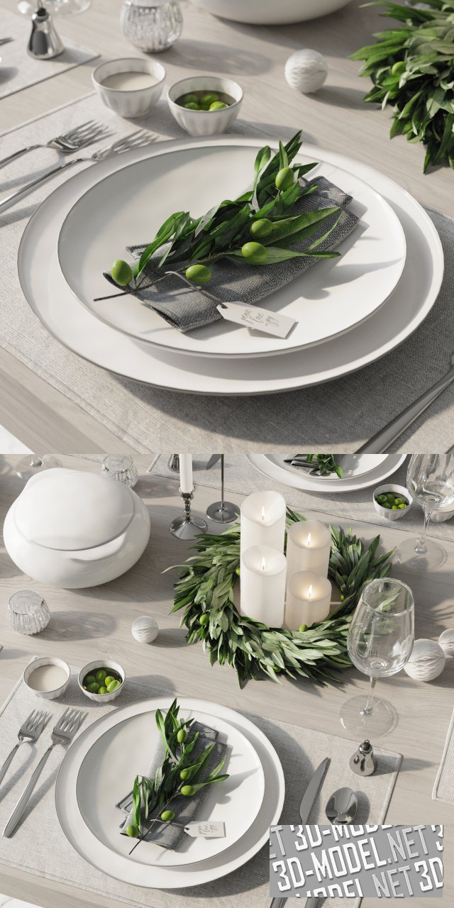 Белая сервировка праздничного стола, украшенного венками и веточками оливкового дерева. Два плотных венка окружают композиции из четырех толстых белых свечей разной высоты, стоящих в центре стола, рядом с белой супницей. Обеденный сервиз на шесть персон включает в себя пару круглых белых тарелок разного диаметра на прямоугольной тканевой салфетке белого цвета, серебристые столовые приборы, по два небольших белых соусника (с белым соусом и зелеными оливками в масле), стеклянные винные бокалы, небольшой хрустальный стаканчик.