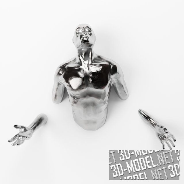 Современная скульптура от Matteo Pugliese, в виде хромированной мужской фигуры, «материализующейся» из плоскости стены. Драматично изогнутый торс, плечи, шея, голова и кисти рук с частью предплечья воссозданы с хорошей реалистичной детализацией, будто застыли из расплавленного металла.