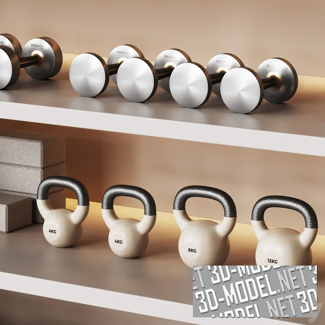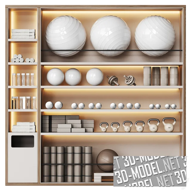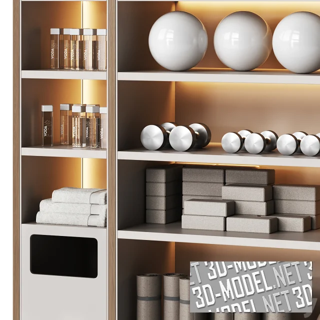 Высокий просторный стеллаж из плит с текстурой дерева и белыми вставками, наполненный спортивными принадлежностями для занятий фитнесом и йогой. Одна из ячеек оснащена белой створкой. На остальных полках со скрытой подсветкой: свернутые карематы песочного цвета, пробковые блоки-кирпичики для йоги, гири со светло-бежевой отделкой, комплект стальных гантелей, колеса для пресса, рельефные валики, белые гладкие мячи, большие белые фитнес-мячи. В левой (узкой) секции стеллажа, на небольших полках: свернутые и сложенные белые махровые полотенца и стильные, квадратные бутылочки из прозрачного материала с белыми крышками. Бутылочки наполнены водой.