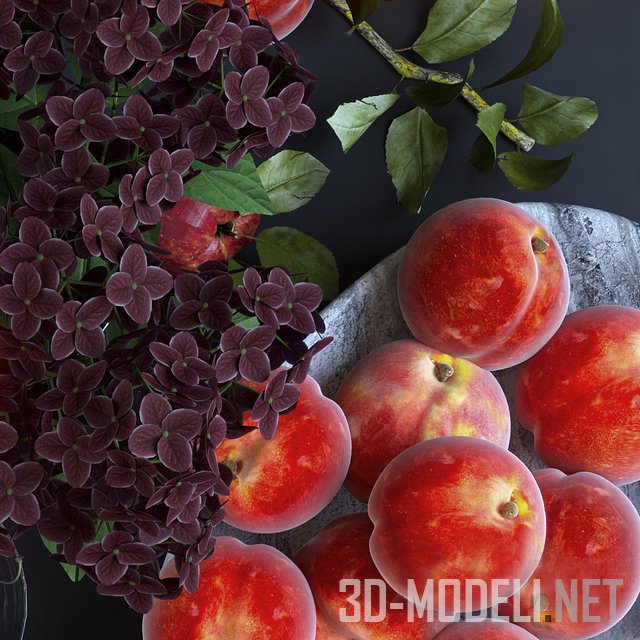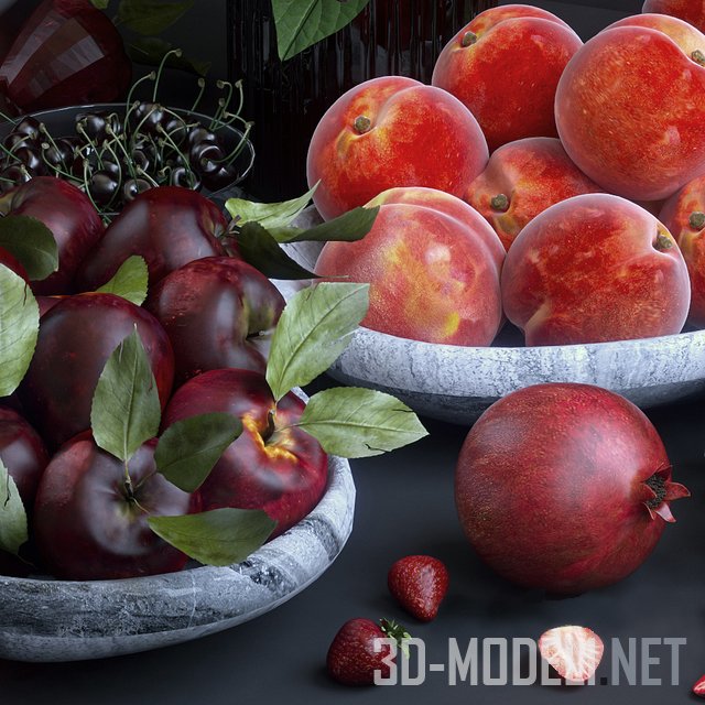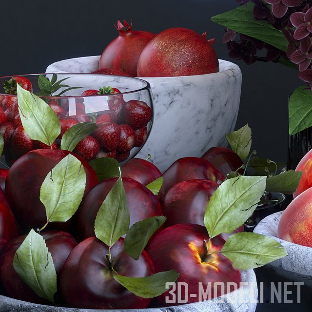 Натюрморт из фруктов, ягод и зелени с доминантой красного цвета. Темно-красные яблоки, плоды граната, почти черные спелые вишни, ягоды клубники и персики размещены на блюдах из мрамора и в стеклянных вазочках. Темно-красная гортензия, веточка мяты и зеленые листья персиков и яблок добавляют в натюрморт свежую ноту.