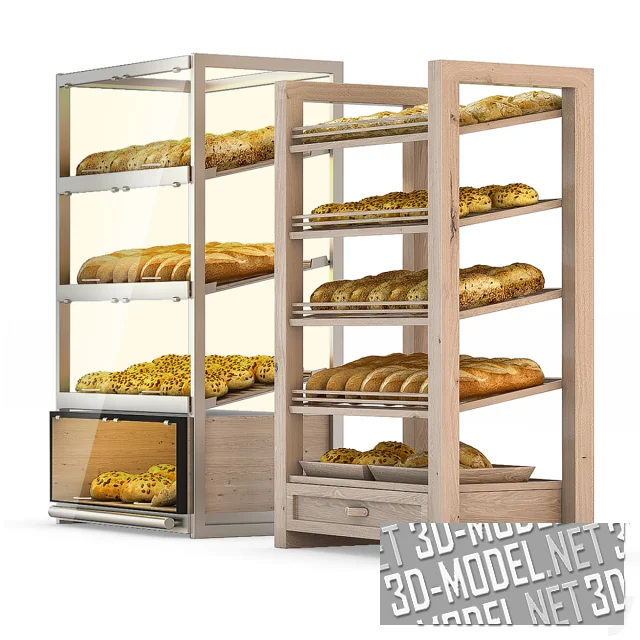 Металлический и деревянный стеллажи-витрины для магазина хлебо-булочных изделий, с продукцией на полках. Стеллаж с металлическим каркасом прикрыт прозрачным стеклом и оборудован встроенной подсветкой. Габарит: 190х120х75см. Витрина из деревянного бруса оборудована наклоненными к передней стороне полками и закрытой секцией с выдвижным ящиком снизу. Габарит деревянного стеллажа: 175х110х67см. На полках витрин разложены аппетитные хлебо-булочные изделия.