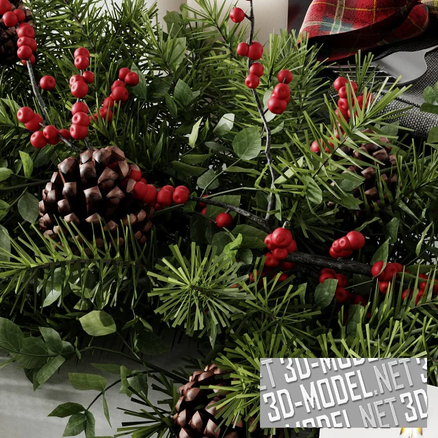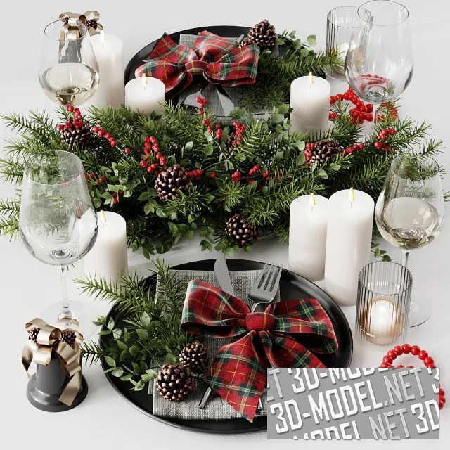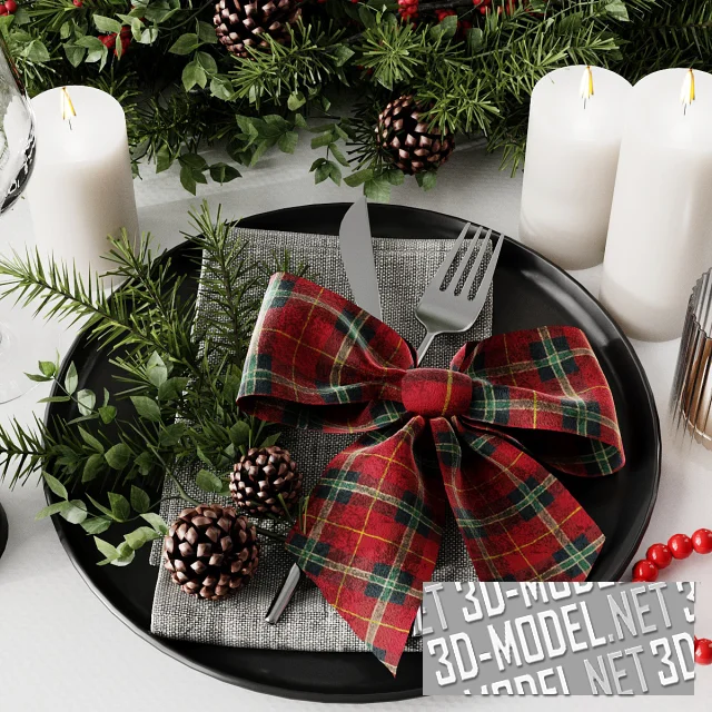 Красочная сервировка на Рождество. На темных тарелках лежат салфетки, столовые приборы, шишки, еловые ветки и клетчатые красно-зеленые банты в шотландском стиле. Дополняют композицию свечи, бокалы, бусы, колокольчики. Декоративный набор станет гармоничным дополнением в праздничном интерьере.