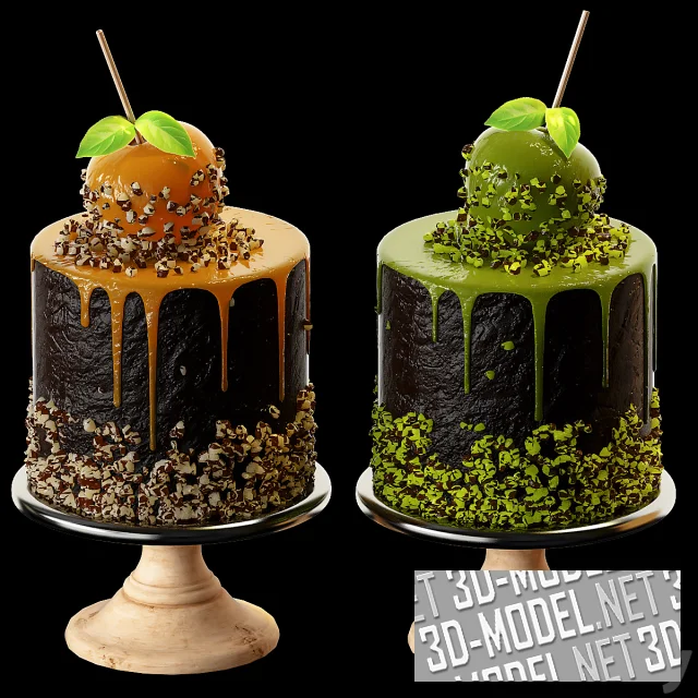Кондитерская круглая металлическая подставка на точеной деревянной ножке, с размещенным на ней торте «Яблоко в карамели». Высокий цилиндрический шоколадный бисквит с темно-коричневой коркой декорирован цветным стекающим топингом, присыпан измельченными орехами и увенчан яблоком на шпажке с парой листиков. Представлено два варианта оформления торта - с оранжевым и зеленым декором.
