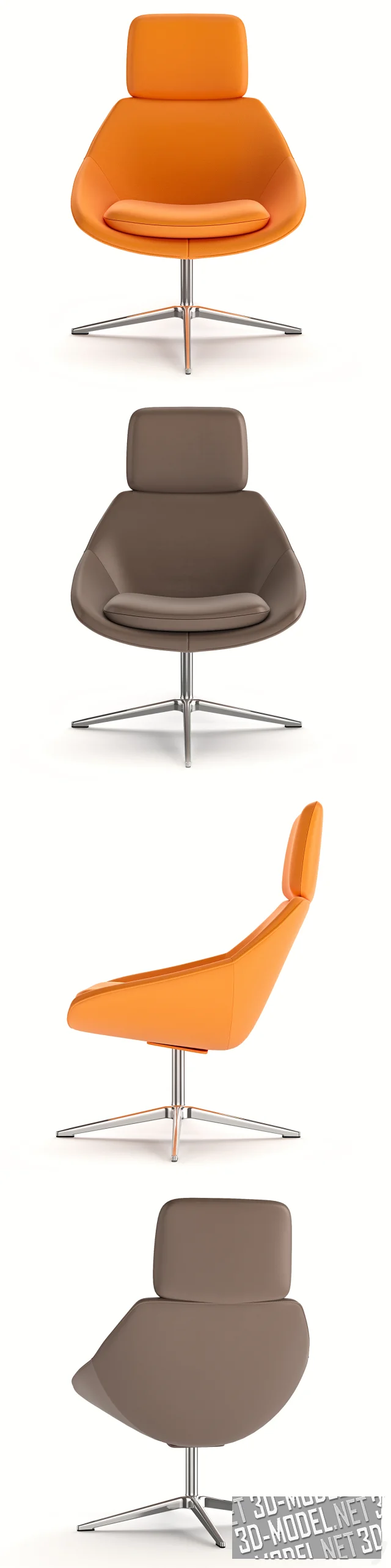 Небольшое современное кресло Open A641 от Allermuir (дизайн студии PearsonLloyd, разработали дизайнеры Luke Pearson и Tom Lloyd) на серебристой металлической опоре с крестовиной. Мягкое вогнутое сиденье со спинкой дополнено небольшой подушкой и прямоугольным подголовником, закрепленным на верхней кромке невысокой спинки. Обивка мягких элементов представлена в оранжевом и бледно-коричневом (табачном) вариантах.
