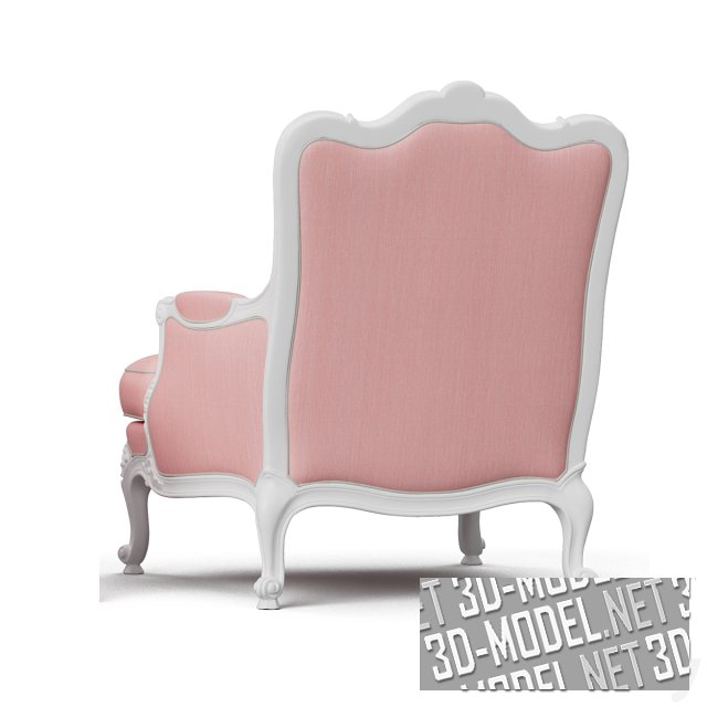 Классическое кресло в стиле Людовика XV, модель 11491 от Angelo Cappellini. Кресло обтянуто розовым материалом. Деревянные ножки, каркас спинки и подлокотников декорированы резьбой и окрашены в белый цвет. На сиденье лежит небольшая светлая декоративная подушка.