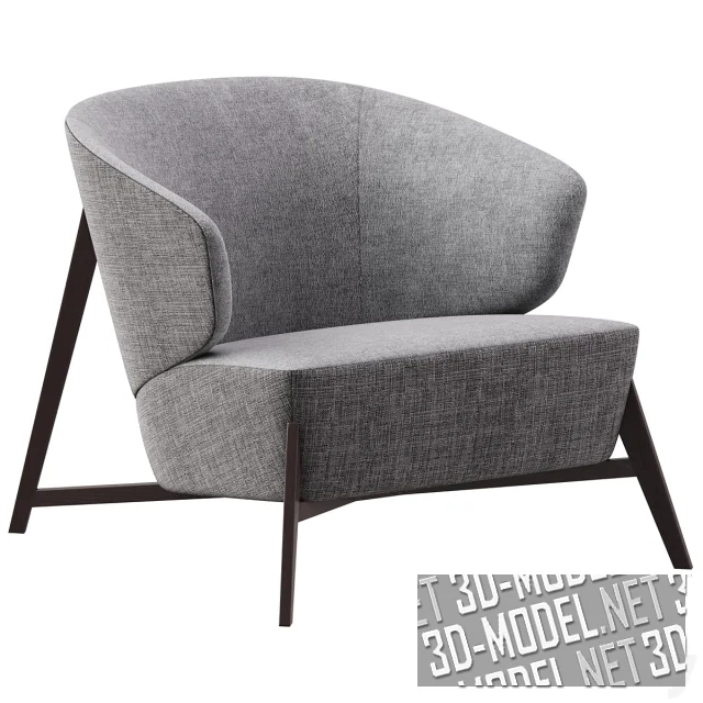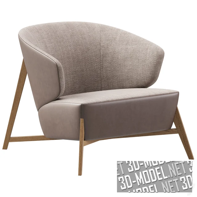 Кресло с низкой посадкой и мягким корпусом на расставленных ножках из дубовых реек - ARSENALE LC1 от Innova Imbottiti (дизайнер: Antonio Fattore). Задние ножки выполнены в виде высоких подпорок, достигающих вершинами верхней части огибающей спинки с основой из гнутой фанеры. Передние ножки тоже удлинены над плоскостью крестовины-основы и служат «стопорами» ложа для мягкого сиденья. Обивка сиденья и спинки скомбинирована из двух материалов. Внутренние плоскости - один материал, наружные - другой.