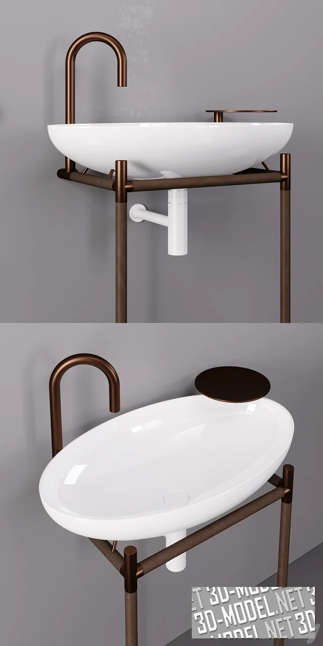 Matteo Thun & Antonio Rodriguez). Овальная раковина Cristalplant® Bio Active имеет габарит 70х43х115см. Каркас собран из стальных трубок (цвета темной меди или серебра) и дерева (табачного или серого цвета). В элемент каркаса интегрированы высокий излив и круглая площадка на ножке, служащая небольшим столиком для аксессуаров (зубных щеток, мыльницы и пр.).