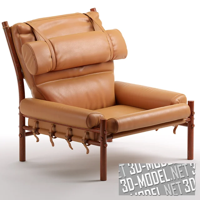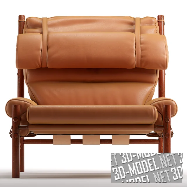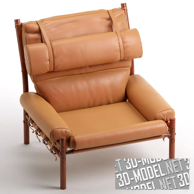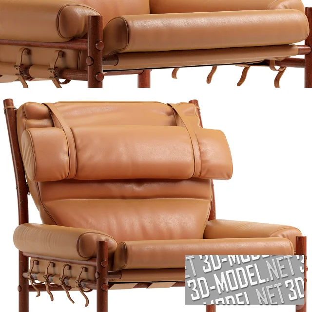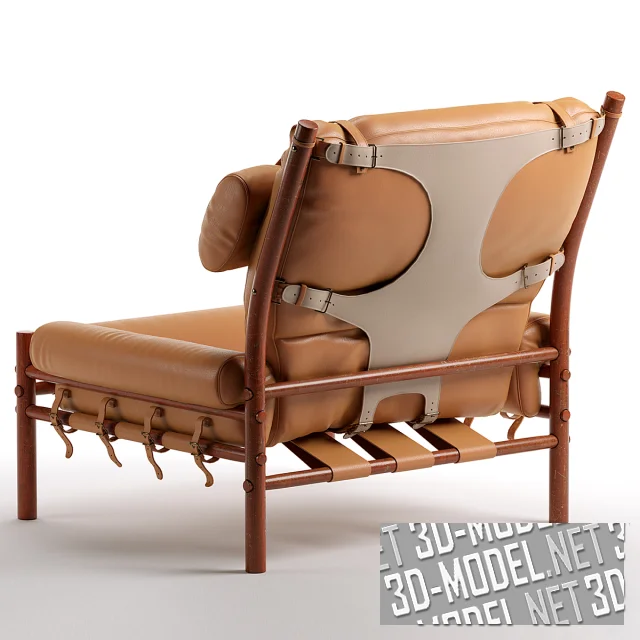 Arne Norell), на коричневой деревянной раме с оранжево-охристой кожаной обивкой. Мягкие элементы закреплены на каркасе кожаными ремешками. Подлокотники выполнены в виде небольших валиков. Большая мягкая подушка дополнена горизонтальным, подвешенным на двух ременных петлях, валиком. Габарит кресла: 90х91х80см.