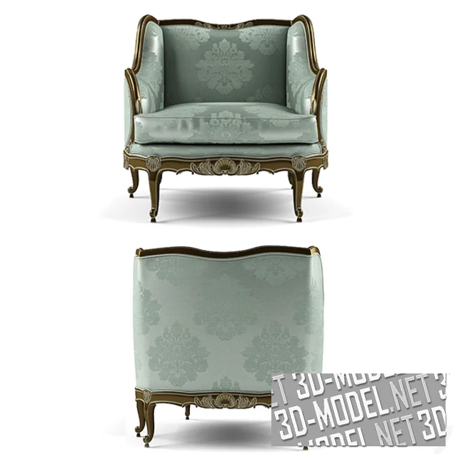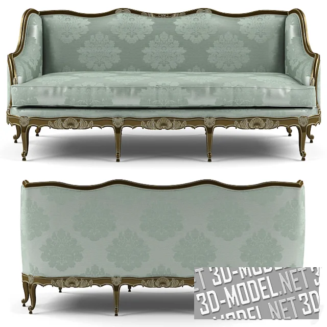 Классический трехместный диван CHLOE от ARTEARREDO Schleret (коллекция: Diner du Roi). Деревянная рама на десяти небольших резных ножках, с огибающими криволинейными подлокотниками и фигурной спинкой выкрашена в золотистый цвет со светлой патиной во впадинах резьбы. В резьбе просматриваются элементы в стиле рококо и барокко. Обивка дивана (основа, мягкие вставки и подушка сиденья) - атласный текстиль жемчужно-мятного цвета с дамасским орнаментом. Габарит дивана: 214х96х97см.