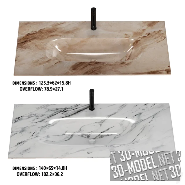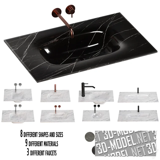 Большая коллекция современных раковин от ARTELINEA из натурального мрамора и искусственного камня, в комплекте со смесителями. Раковины разной формы (восемь вариантов формы и размеров) изготовлены из цельного куска мрамора с прямоугольным фрагментом столешницы. Представлено девять вариантов материала (серых оттенков, черный мрамор с белыми прожилками, серый с белым, бежевый с коричневым, бежевый с белым, белый с черным, белый с серым и розовый с белым).