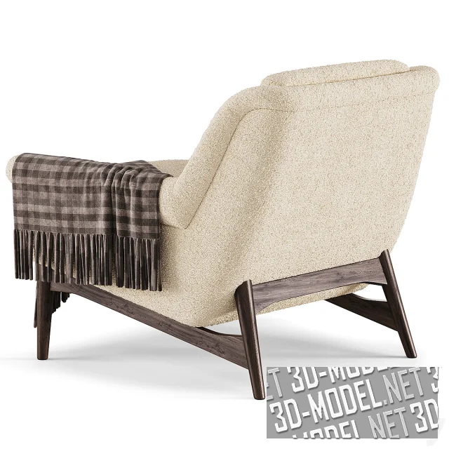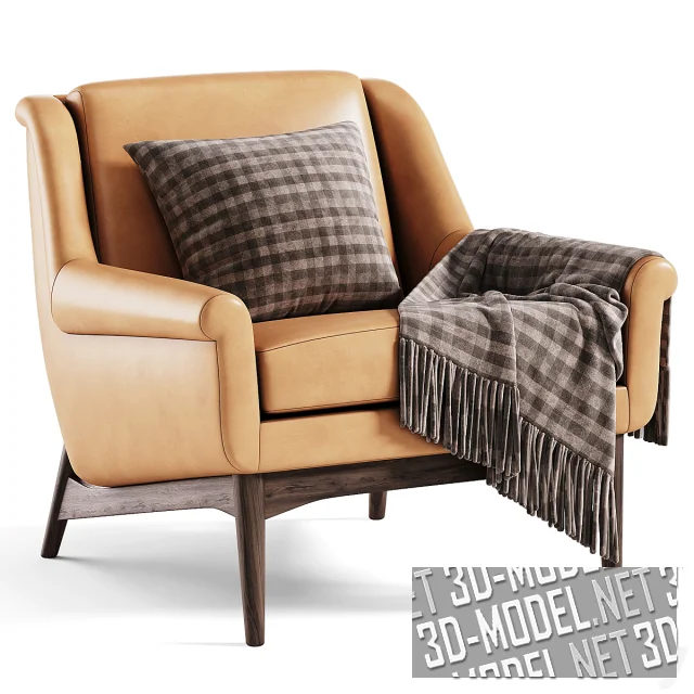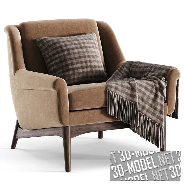 Акцентное современное компактное кресло Lulu от Artemest (DOM Edizioni, 2017 года) с коричневыми подушкой и пледом в клетку. Мягкие элементы (спинка с небольшими отворотами назад, невысокие подлокотники с отворотами в сторону и сиденье с квадратной подушкой) обиты материалом трех видов: бело-сливочное букле, охристая кожа, матовый светло-коричневый велюр. Деревянные ножки с наклонными боковыми перекладинами распорок тонированы коричневым лаком. Габарит кресла: 81х81х75см.