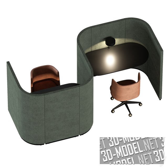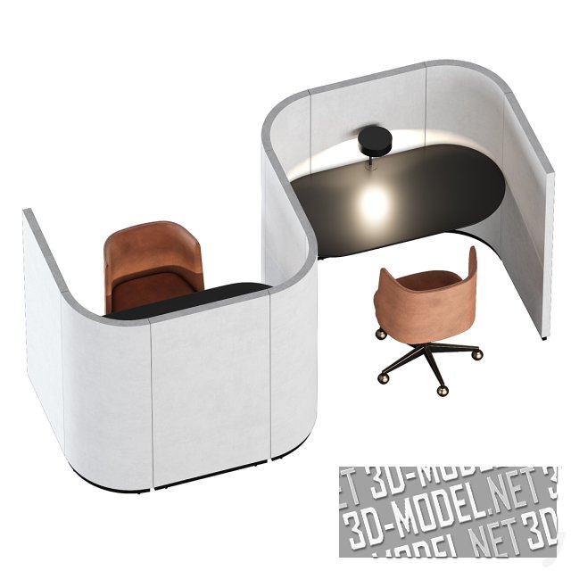 Современная рабочая офисная зона на две персоны AE-DSK-SET 021 Avion Keith Melbourne. Изоляция двух рабочих мест осуществлена с помощью S-образной перегородки с мягкой обивкой. В образовавшихся нишах обустроены столы с настольными лампами и кресла на роликах. Представлено несколько вариантов отделки перегородки: коричневая, серо-зеленая, светло-бежевая, белая. Такие блоки легко комбинируются в группы для крупных пространств.