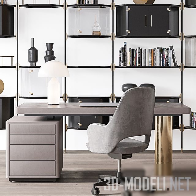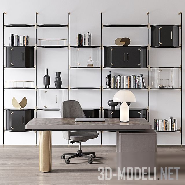 Бренд Baxter и дизайнеры Roberto Lazzeroni, Pietro Russo и Vico Magistretti предлагают создать элегантный интерьер кабинет с помощью набора мебели и аксессуаров. Сет содержит рабочий стол Verba Volant Slim, удобное офисное кресло Colette, стеллаж Libelle (высота 2750 мм). Стеллаж дополнен множеством декоративных элементов и аксессуаров, среди которых настольная лампа Oluce Atollo.