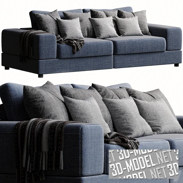 Двухместный прямой минималистичный диван modool от Boss, с текстурированной текстильной обивкой грязно-синего цвета. Диванные подушки двух размеров, в чехлах серого и темно-серого цвета. Дополняет диван плед с бахромой и черно-серым геометрическим орнаментом. Две прямоугольные подушки сиденья дивана, низкие прямые подушки подлокотников и две мягкие подушки спинки смонтированы на спаренной прямоугольной базе с небольшими ножками.