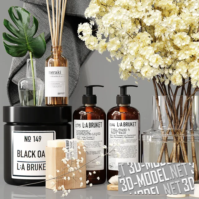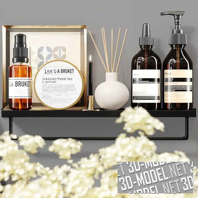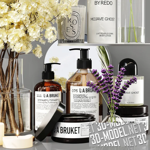 Многокомпонентная композиция для интерьера ванной комнаты. Содержит средства по уходу от известных брендов (Aesop, LA Bruket, Byredo), букеты из сухой травы, свечи, щетки, полотенце и пр.