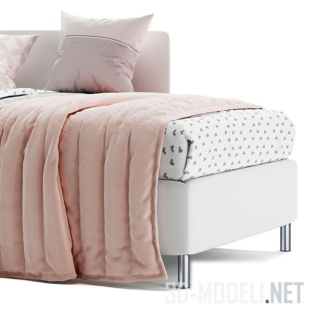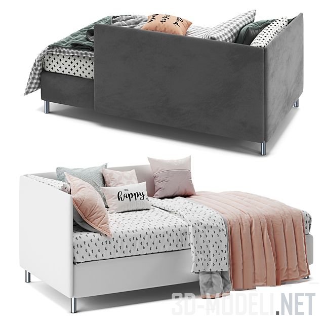 Современная односпальная кровать от итальянской фабрики Citterio Meda. Обивка предлагается в темном или светлом цвете. Кровать дополнена постельным бельем и подушками, и отлично подойдет для комнаты девочки или мальчика.