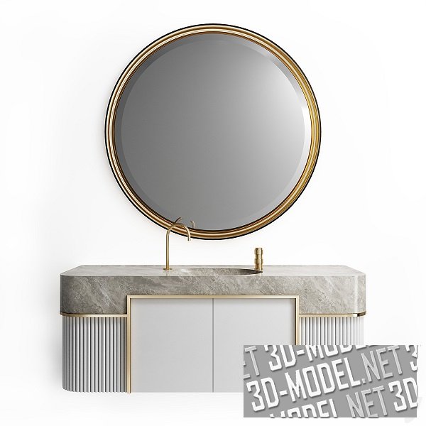 Элегантная мебель от итальянской фабрики Colombo Mobili, серия Nomad. В комплекте тумба (Mod. 824), размер: 1770 x 650 x 610 мм и круглое зеркало (Mod. 825). Размер зеркала: 1430 x 60 x 1430 мм. Сочетание светлых фасадов, золотистой отделки и благородного камня делает мебель очень изысканной.