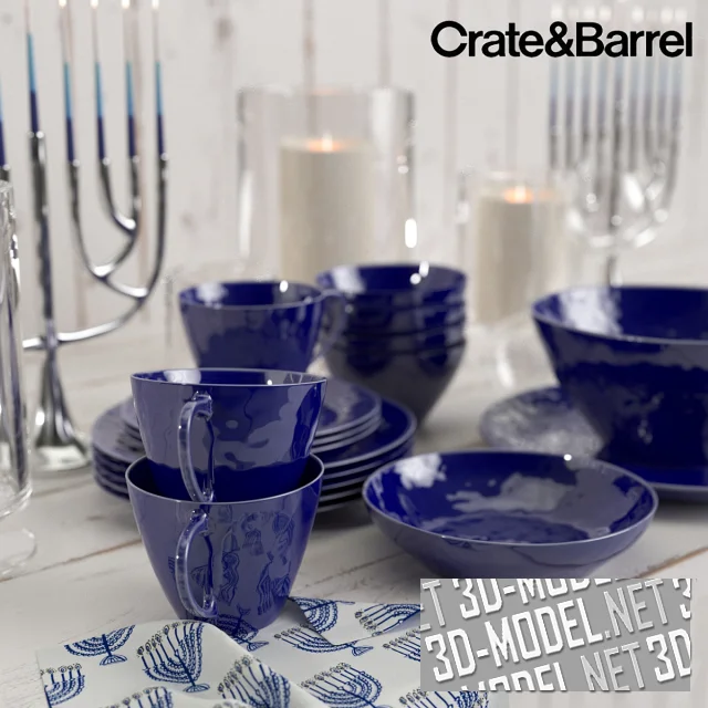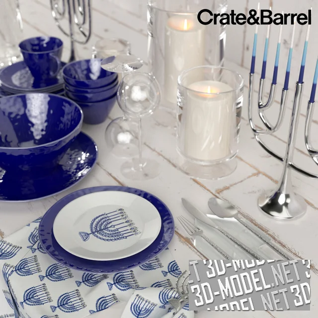 Набор посуды и аксессуаров для сервировки стола в праздник Ханука. В наборе: посуда Baltic темно-синего, кобальтового цвета (тарелки, миски, чашки, блюдца), белое блюдце с изображением синего девятисвечника, тканевые салфетки Menora с паттерном из синих девятисвечников по белому фону, серебристое металлическое кольцо для салфеток Menora, металлические серебристые меноры с трехцветными (синий/голубой/белый) тонкими свечками, толстостенные стаканы-подсвечники из прозрачного стекла с толстыми белыми свечами (London hurricane и London hurricane mini), столовые приборы Boulder, прозрачный бокал для белого вина Camilla.