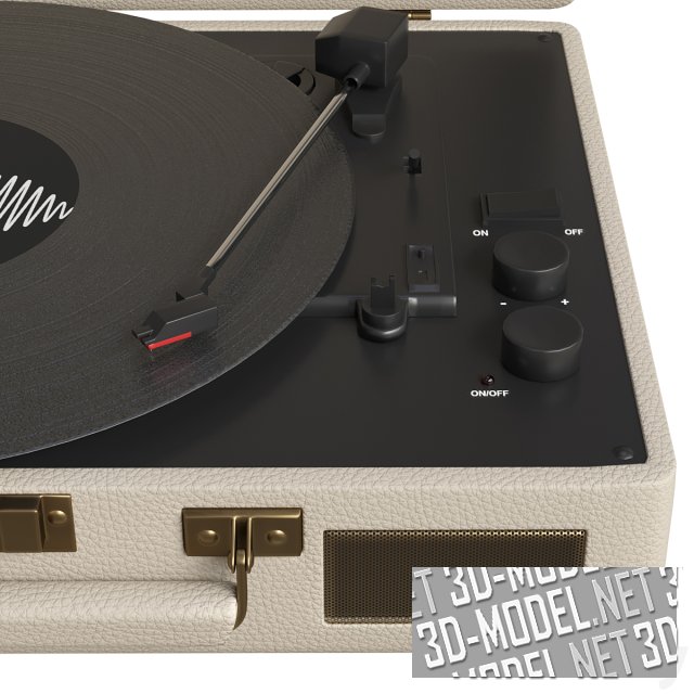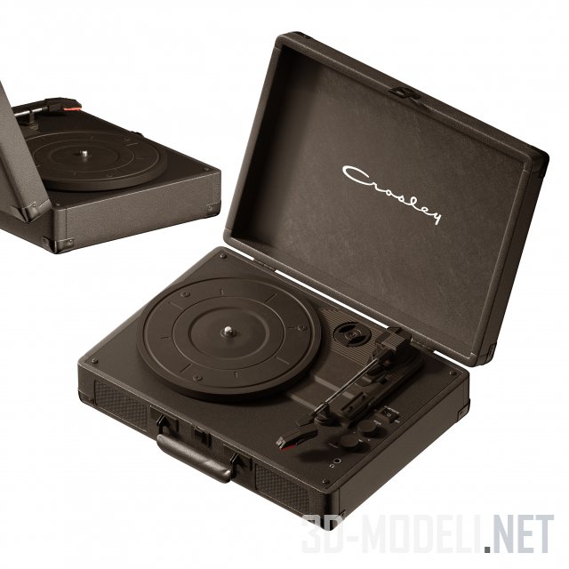 Переносной проигрыватель для виниловых пластинок Cruiser от Crosley. Корпус проигрывателя размещен в небольшом чемоданчике, обитом текстурированной кожей кремового цвета. Уголки, замки, кнопки, элементы ручки и петли - темная латунь. По центру внутренней плоскости крышки нанесен логотип производителя.