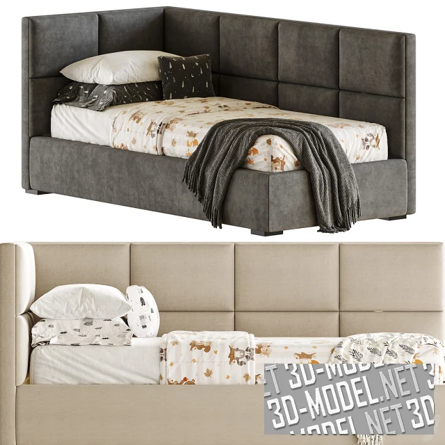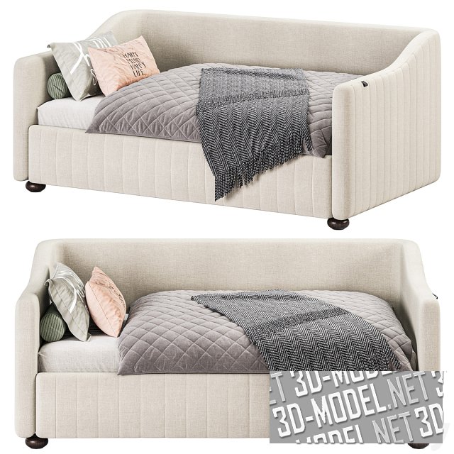 Бледно-бежевая и бледно-оливовая современные детские диван-кровати KD75 от Delavega с комплектом постельного белья. Наружные плоскости небольших мягких подлокотников переходят в спинку. Они и высокий цоколь дивана, за которым скрывается выдвижное место для хранения постельного белья или оборудования дополнительного спального места, декорированы вертикальной прострочкой. Небольшие точеные деревянные ножки дивана контрастные, черные.
