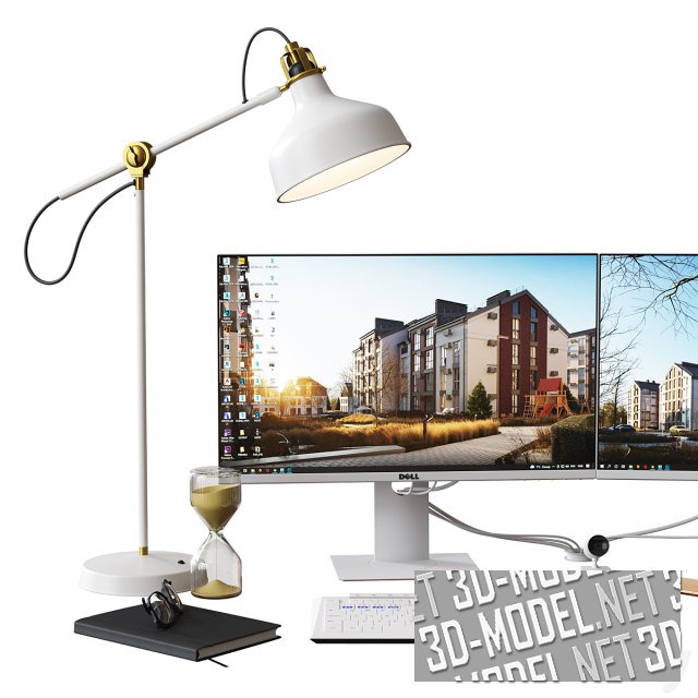 Современные настольные гаджеты и аксессуары. В наборе: спаренные компьютерные мониторы от Dell, беспроводные мышь, клавиатура и наушники, настольный белый с золотистым светильник на круглой подставке, смартфон с золотистым корпусом, песочные часы, органайзер, ручки и карандаши в прозрачном стакане, металлический сетчатый лоток для бумаг, очки.