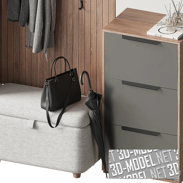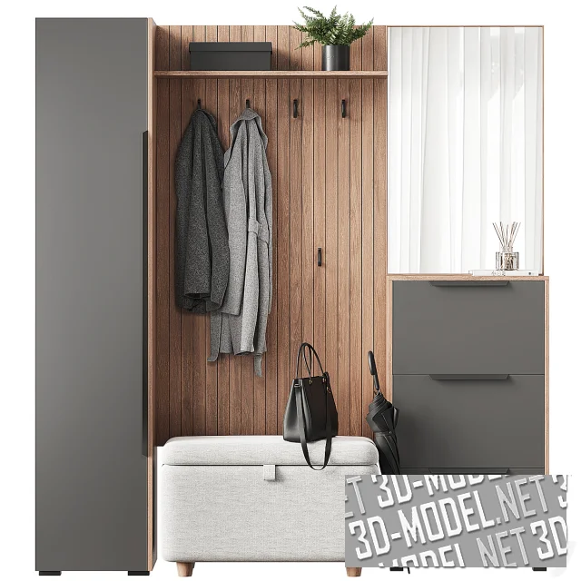 Фасады шкафа и тумбы - графитово-серые, с длинными ручками. Корпуса мебели и стенка с вешалкой и зеркалом выпонены из плит с текстурой светло-коричневого дерева. Задняя стенка блока декорирована вертикальными канавками, имитирующими реечную наборку. На крючках вешалки висят серое пальто и серый пиджак.