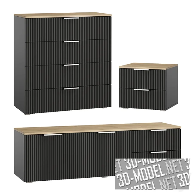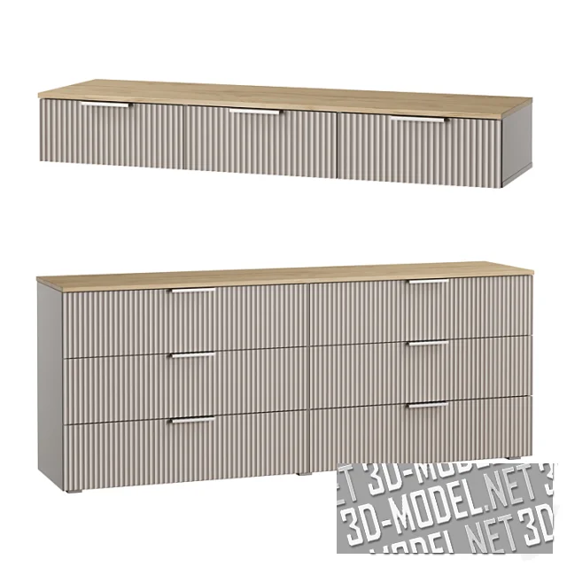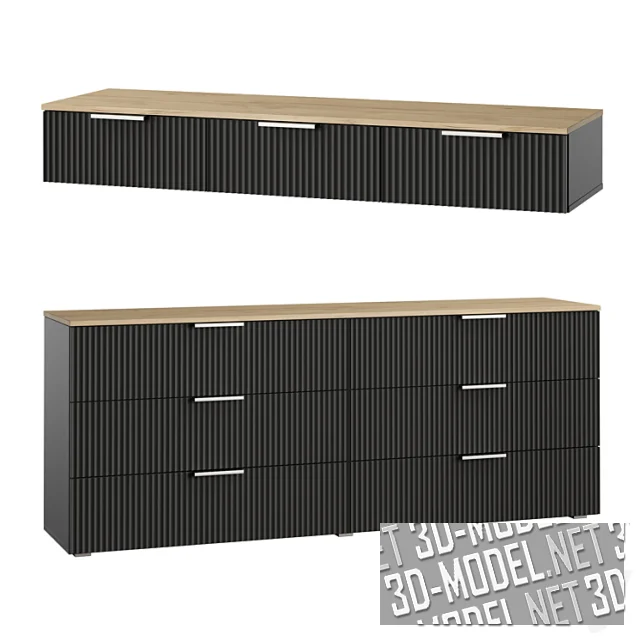 На фасадах смонтированы минималистичные деревянные горизонтальные ручки. Мебель представлена в трех вариантах декора: структура дуба под лаком с белыми фасадами, дерево с графитово-черными фасадами и вариант с белыми корпусами и фасадами с деревянными ножками и ручками.