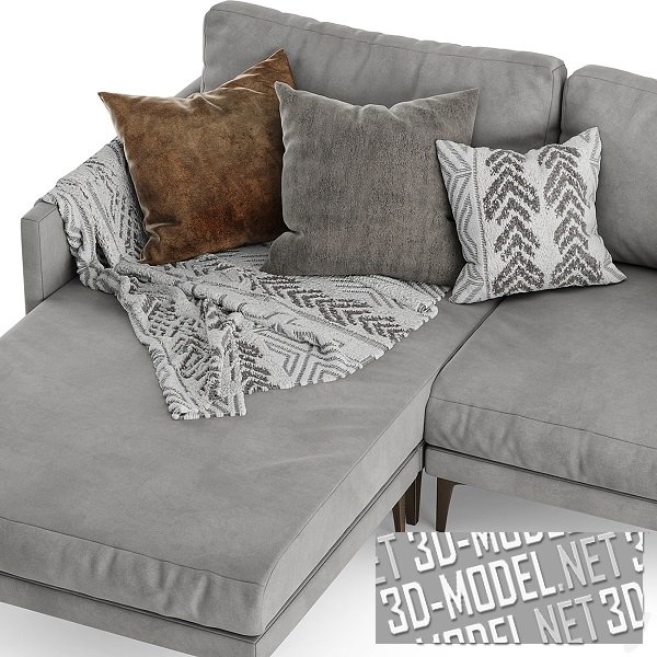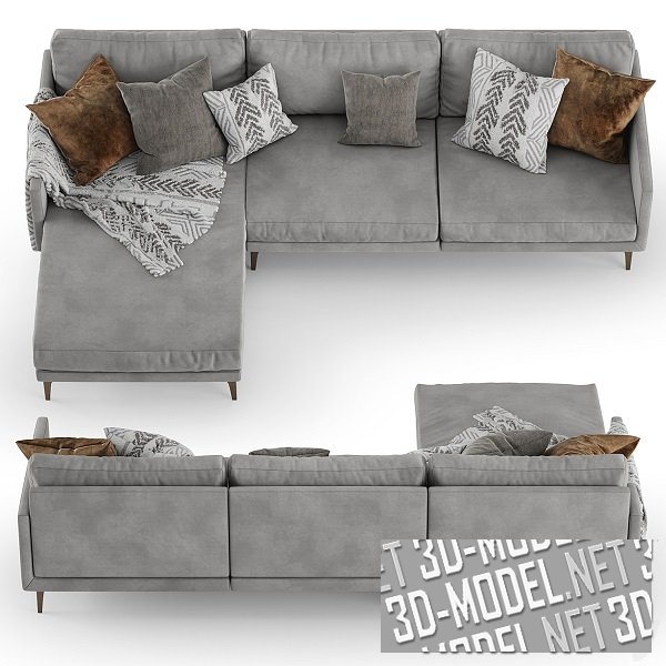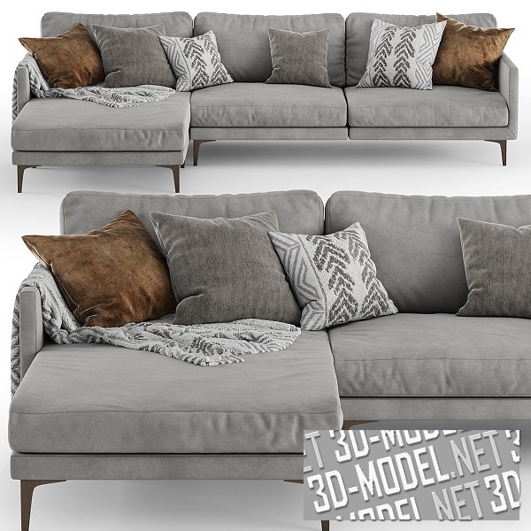 Современный модульный угловой диван CENTQUATRE от Duvivier Canapes со светло-серой текстильной обивкой. Габарит дивана: 277х170х75см. Диван состоит из трех секций на небольших тонких ножках, что визуально облегчает модель. На эту же идею «работают» и узкие подлокотники и тонкая спинка. А комфорт обеспечивают большие мягкие подушки, приставленные к основанию спинки. Небольшие декоративные диванные подушки в серых, коричневых и бело-серых чехлах и бело-серый плед существенно оживляют серую обивку дивана.